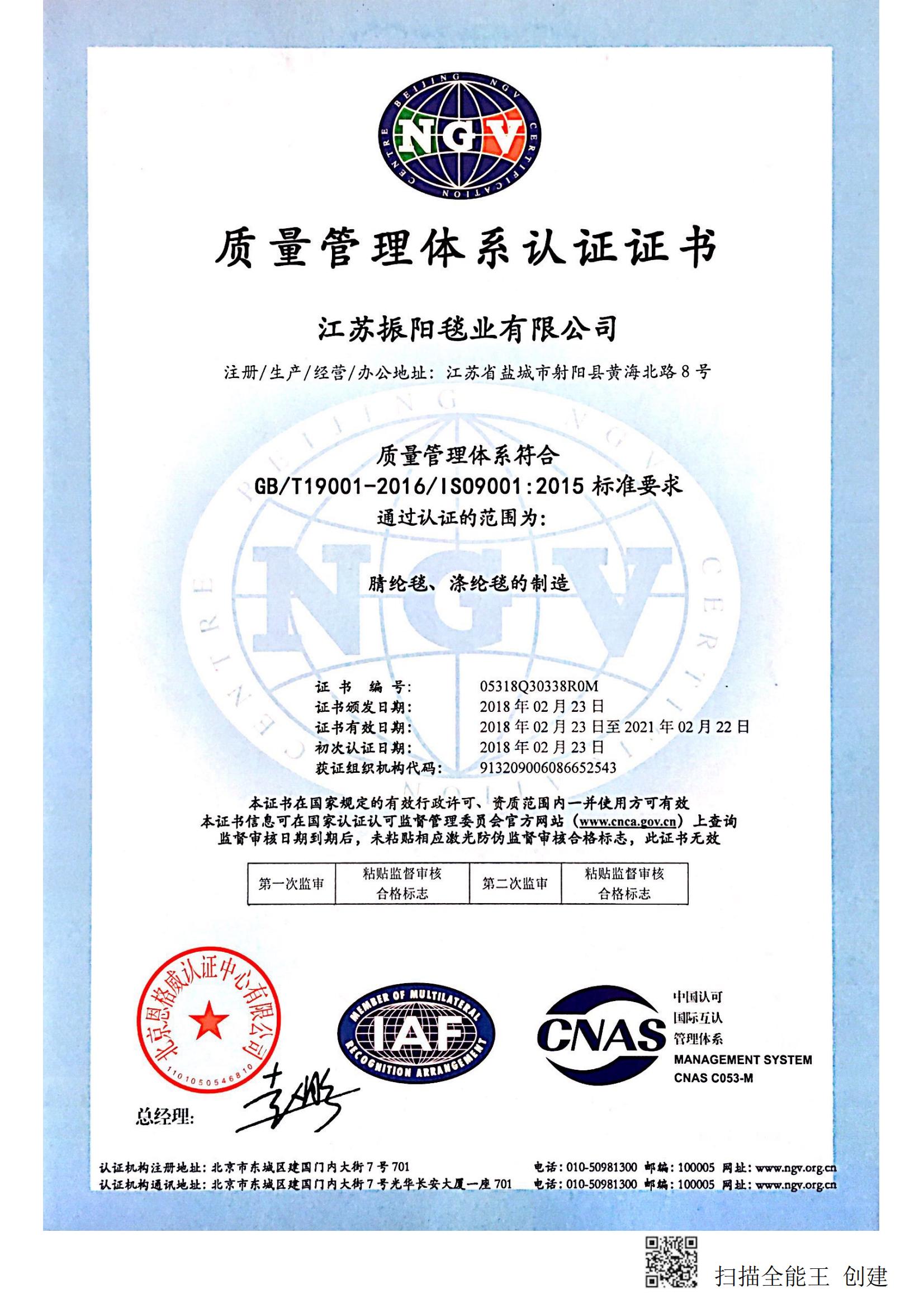 振阳毯业的9001证书